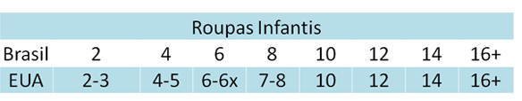 Se você está viajando com crianças ou quer comprar roupas para elas, a numeração das peças também é bem semelhante à do Brasil. O que muda é que muitas vezes uma peça que aqui cabe apenas para uma idade, lá é produzida para atender a demanda de duas numerações. Uma roupa de tamanho 8 no Brasil corresponde à mesma roupa do tamanho 7 ou 8 nos EUA. Além disso, lá você encontra os tamanhos 3, 5, 6x e 7, que não existem no nosso país. Veja a tabela de conversão abaixo.