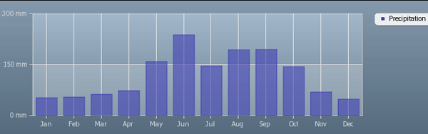 Por outro lado, em dezembro e janeiro, que é inverno e épocas de férias e de festas de fim de ano em Miami, as temperaturas caem um pouco, não ultrapassando os 25 graus. É uma época com pouquíssima chuva, conforme mostra o gráfico abaixo: