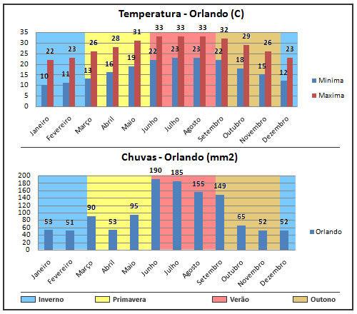 As melhores épocas para viajar para Orlando, pensando no clima, temperatura e na quantidade de pessoas na cidade e nos parques, são a primavera e o outono. Respectivamente, são os meses de março, abril e maio, e os de setembro, outubro e novembro. Nesses meses as temperaturas estão ótimas e o clima fica muito agradável!